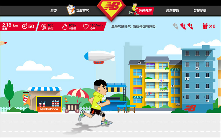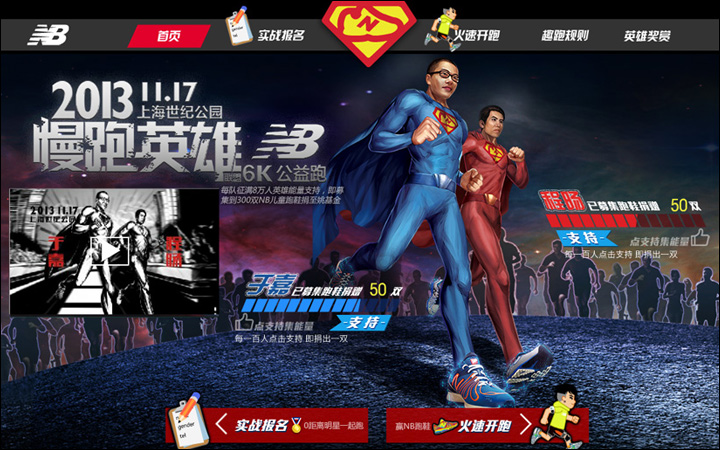 作為其互動營銷代理商的Leadinfo(立特整合營銷傳播機構(gòu))便以英雄扮演的趣味方式為New Balance創(chuàng)意了一款在線趣跑游戲http://newbalance.renren.com,用戶只需用人人網(wǎng)賬號登錄,即可選擇卡通角色邊跑邊體驗身為英雄的快感。