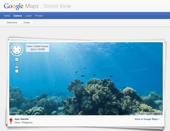 谷歌添加的前幾個海底全景視圖是由凱特琳海景調查組織(Catlin Seaview Survey)提供的,該組織希望通過這種近距離視圖提高人們的海洋保護意識。